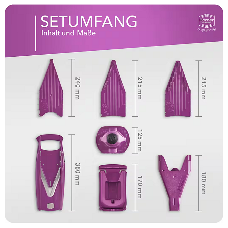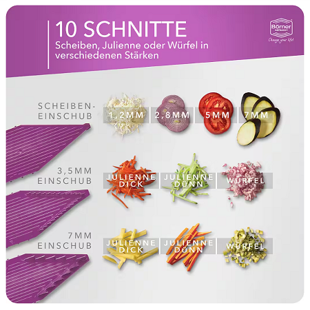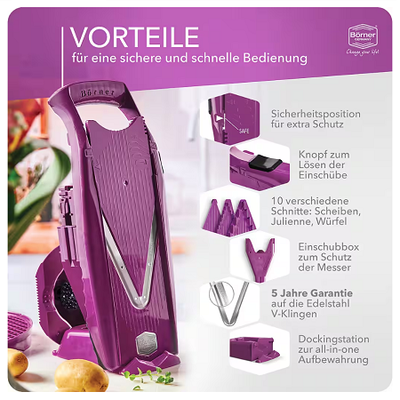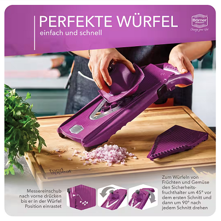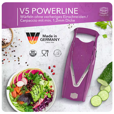 رنده برنر آلمان مدل V5 اصل Borner رنگ بنفش به سه نوع تیغه ضد زنگ بسیار تیز و مقاوم مجهز شده است که عملکردی دقیق و یکنواخت را فراهم می‌کنند. تیغه‌ها از آلیاژ مقاوم در برابر رطوبت ساخته شده‌اند و حتی در استفاده‌های مداوم نیز کیفیت برش خود را حفظ می‌کنند. شما می‌توانید با این رنده انواع سبزیجات مانند هویج، کدو، خیار، سیب‌زمینی و حتی میوه‌هایی مانند سیب و گلابی را به شکل‌های متفاوت برش دهید. قابلیت خردکن، ورقه ورقه کردن و رشته کردن باعث شده است این محصول جای چند وسیله مختلف را در آشپزخانه بگیرد و فضای کمتری اشغال کند.